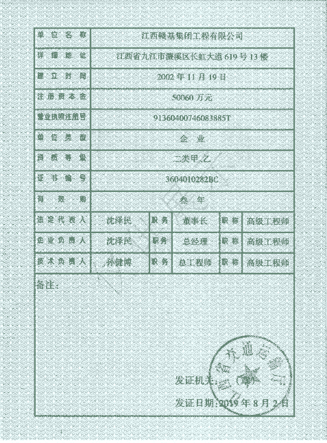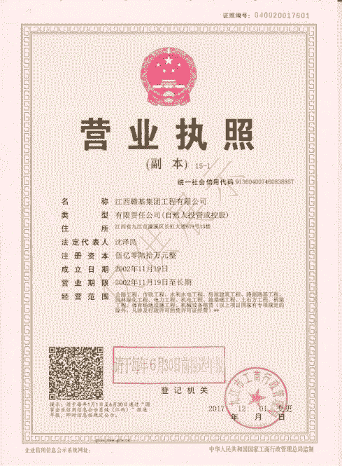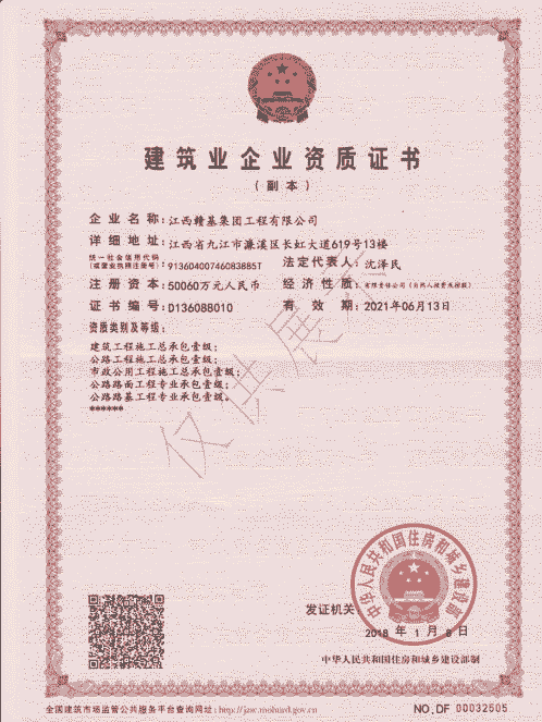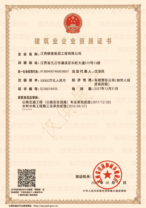 江西贛基集團(tuán)工程有限公司是國家壹級(jí)施工總承包企業(yè),具有公路工程、市政公用工程、房屋建筑工程總承包壹級(jí)資質(zhì);公路路基、路面專業(yè)壹級(jí);水利水電工程、電力工程、城市園林綠化、公路養(yǎng)護(hù)工程貳級(jí)資質(zhì)。